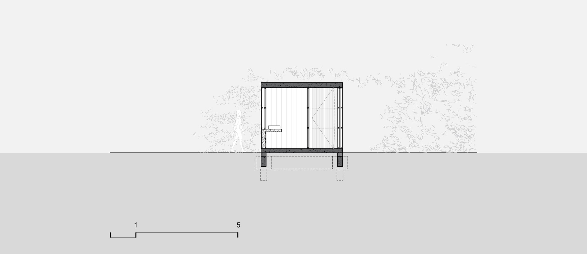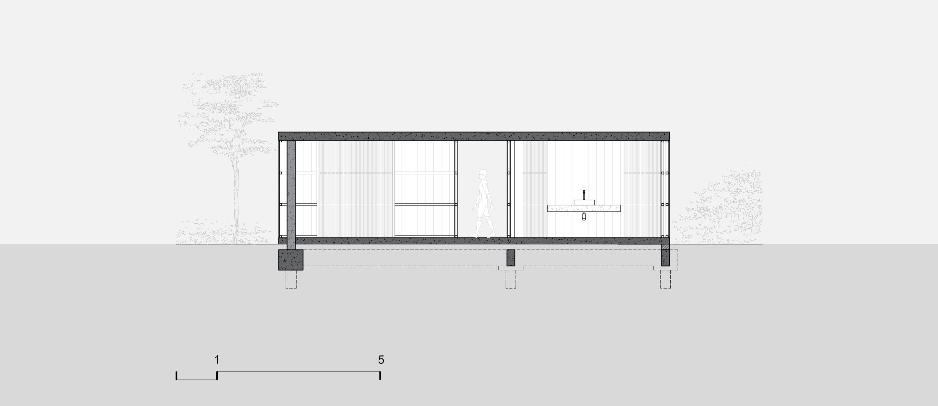 The main structure system is composed by three reinforced concrete pillars, which support a slab, also casted in concrete. In this way, the slab shape establishes the building perimeter. With no other walls, all partitions and closures are made by garapeira wooden boards, framed by metal structure and modulated at intervals of 20cm.