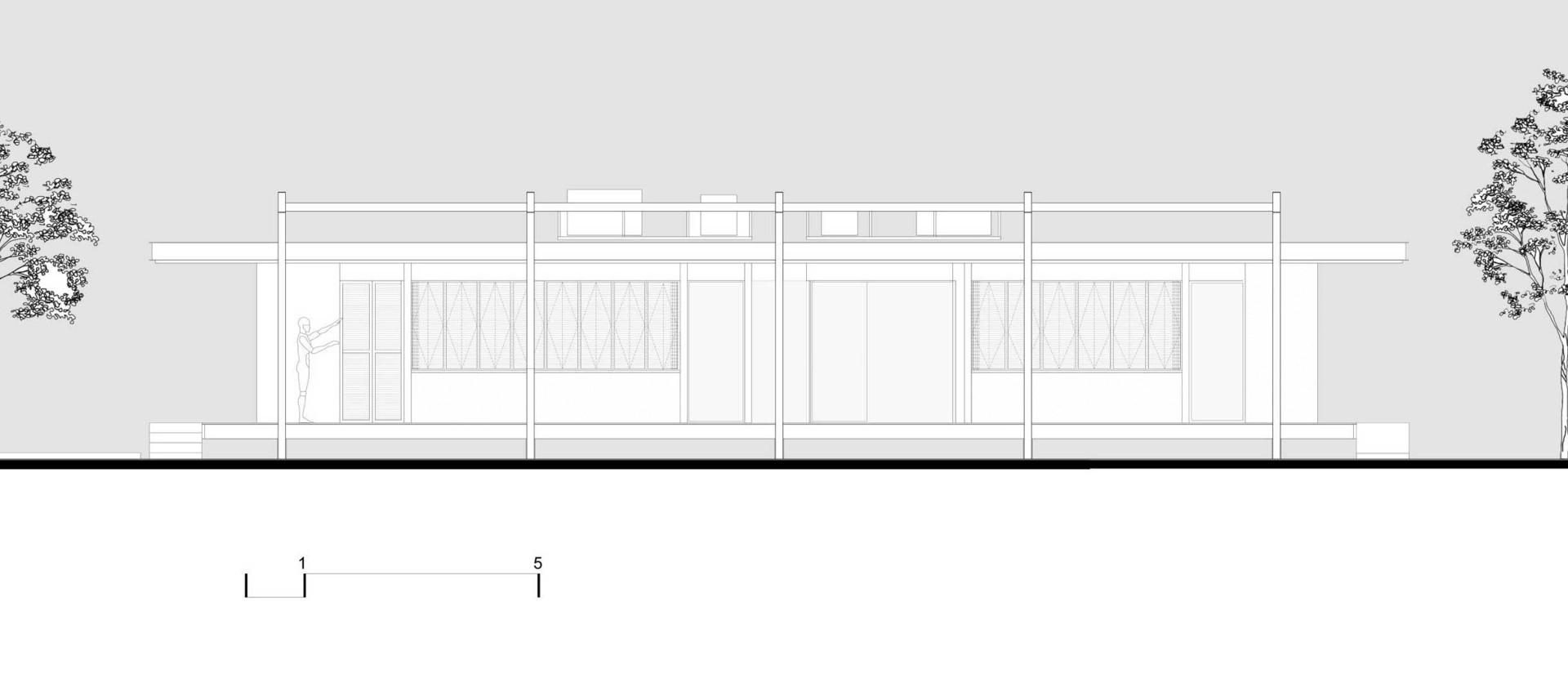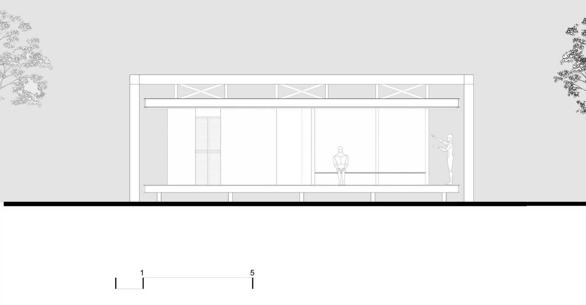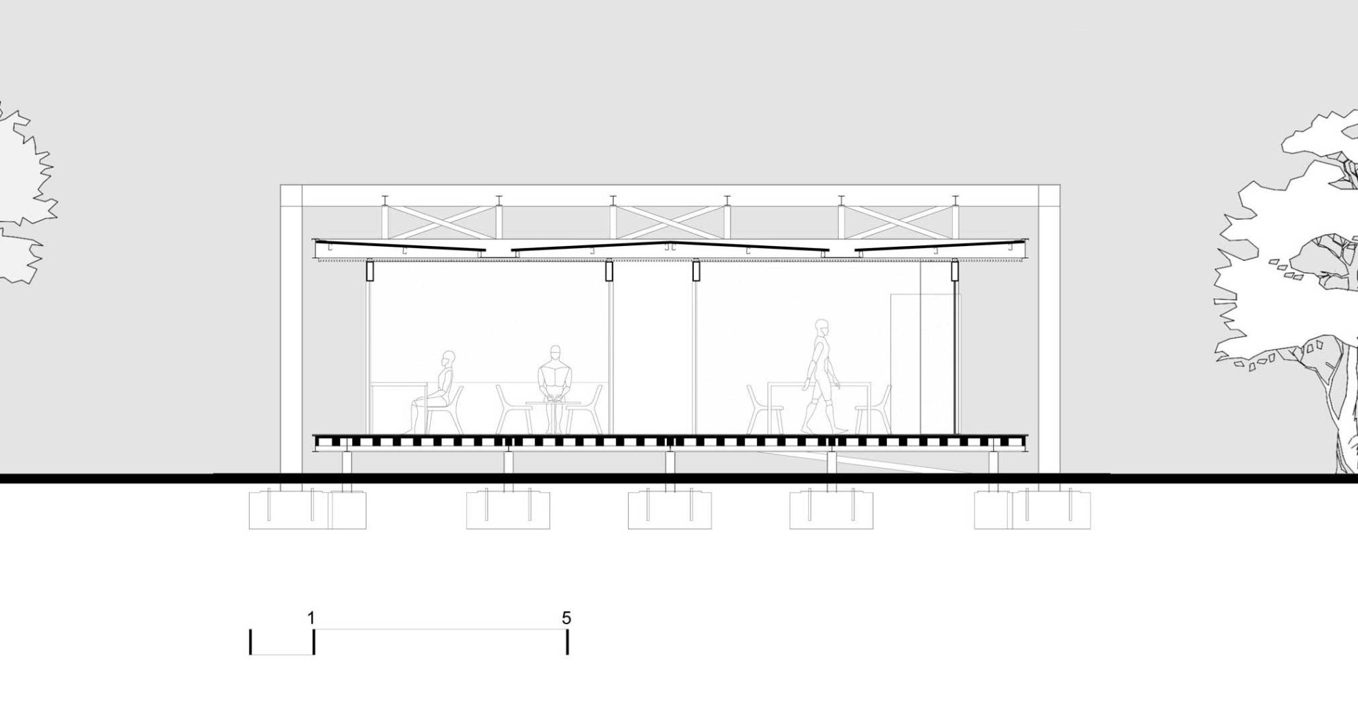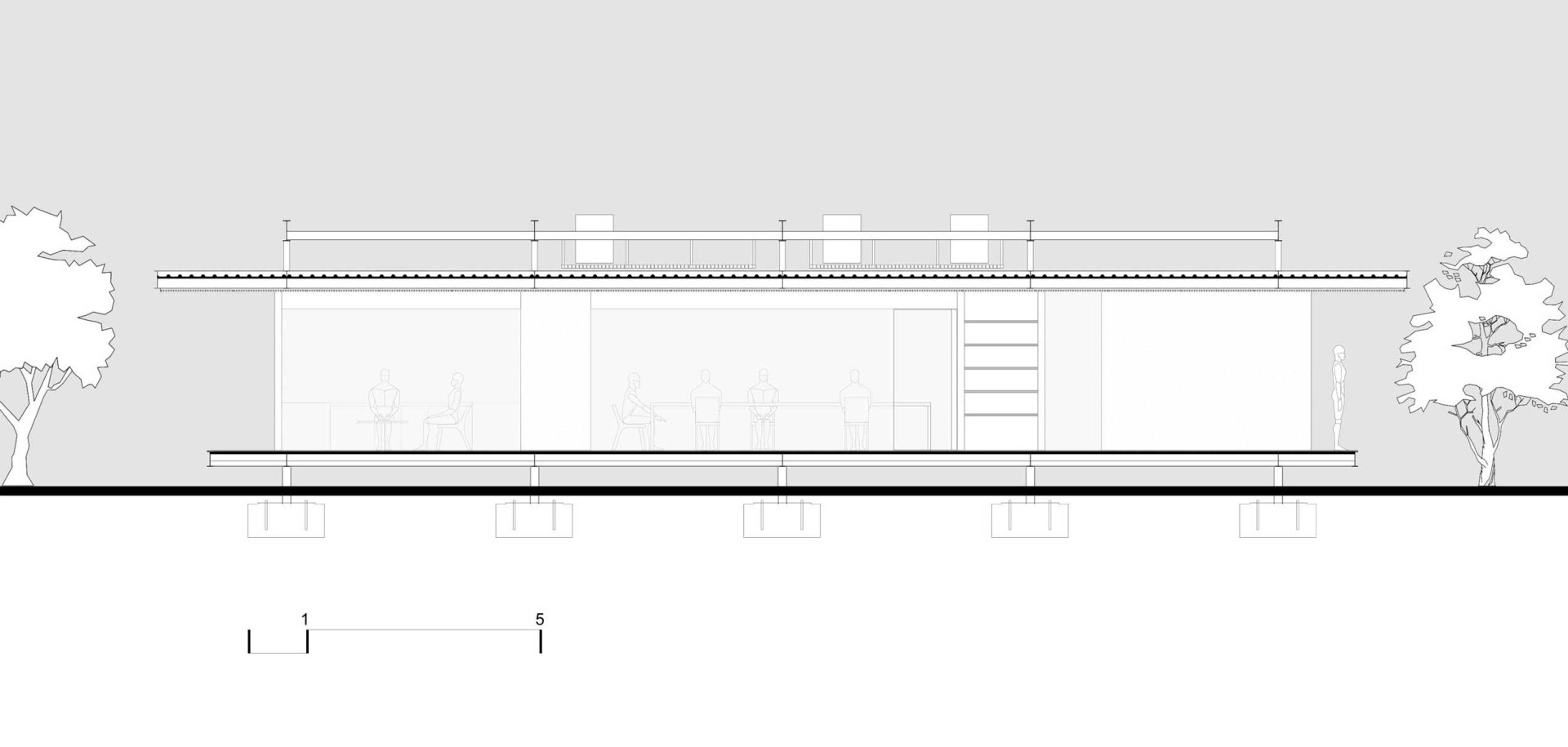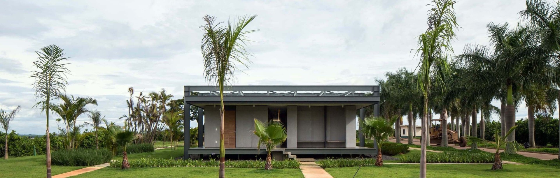 Desta maneira, foi pensado em pórticos metálicos que pendurassem uma grande cobertura, também metálica, sem nenhum pilar interno, e que conteria todos os elementos de infraestrutura superior. O piso é feito em laje de concreto apoiada numa plataforma metálica solta do chão, apoiada em pequenos pilares metálicos. Assim, a construção se caracteriza por dois grandes planos recheados pelo programa. A cota deste piso é determinada pela altura em que os usuários pudessem garantir a vista da plantação de laranja enquanto estivessem nas posições de trabalho, sobretudo na sala de reunião principal.