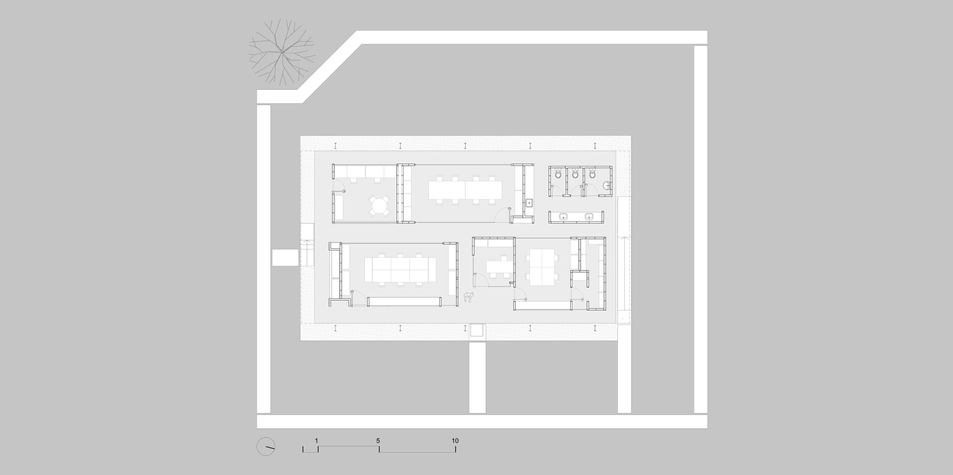 Voltados para o lado oposto, em situação mais protegida em relação ao acesso direto do público, com a vista mais reservada para a plantação, estão as salas de reunião principal e de trânsito, que corresponde a sala de trabalho dos prestadores de serviço fixos ou temporários, como consultores e clientes. Neste mesmo lado, voltados para o oeste e servindo de proteção do sol direto, está o bloco de sanitários e copa, mais fechados e voltados para o interior do conjunto.