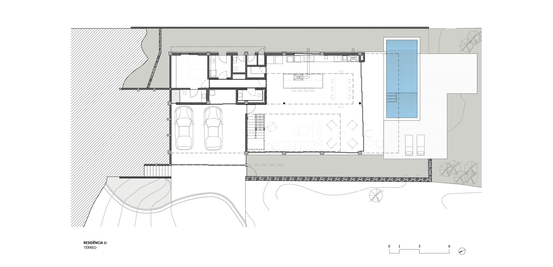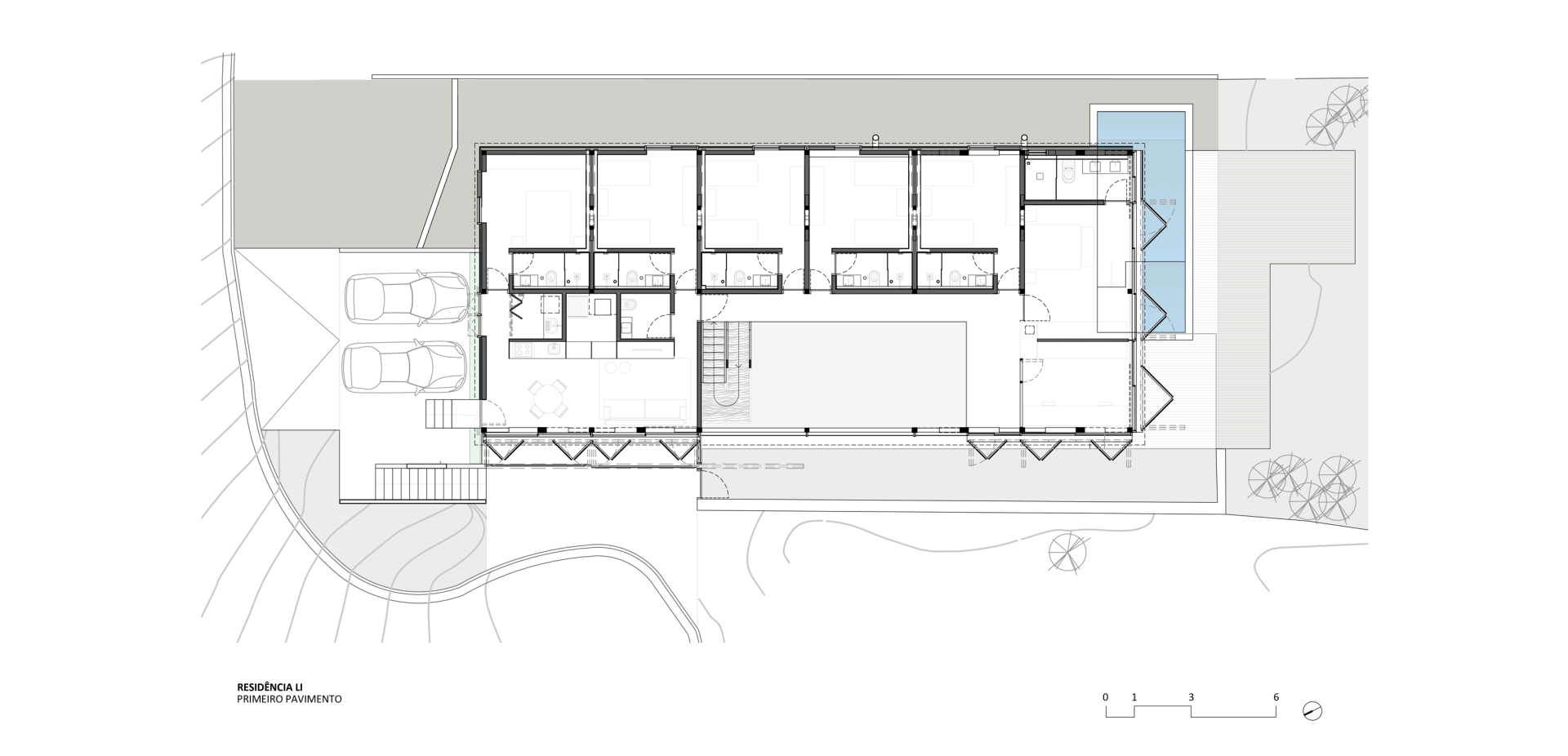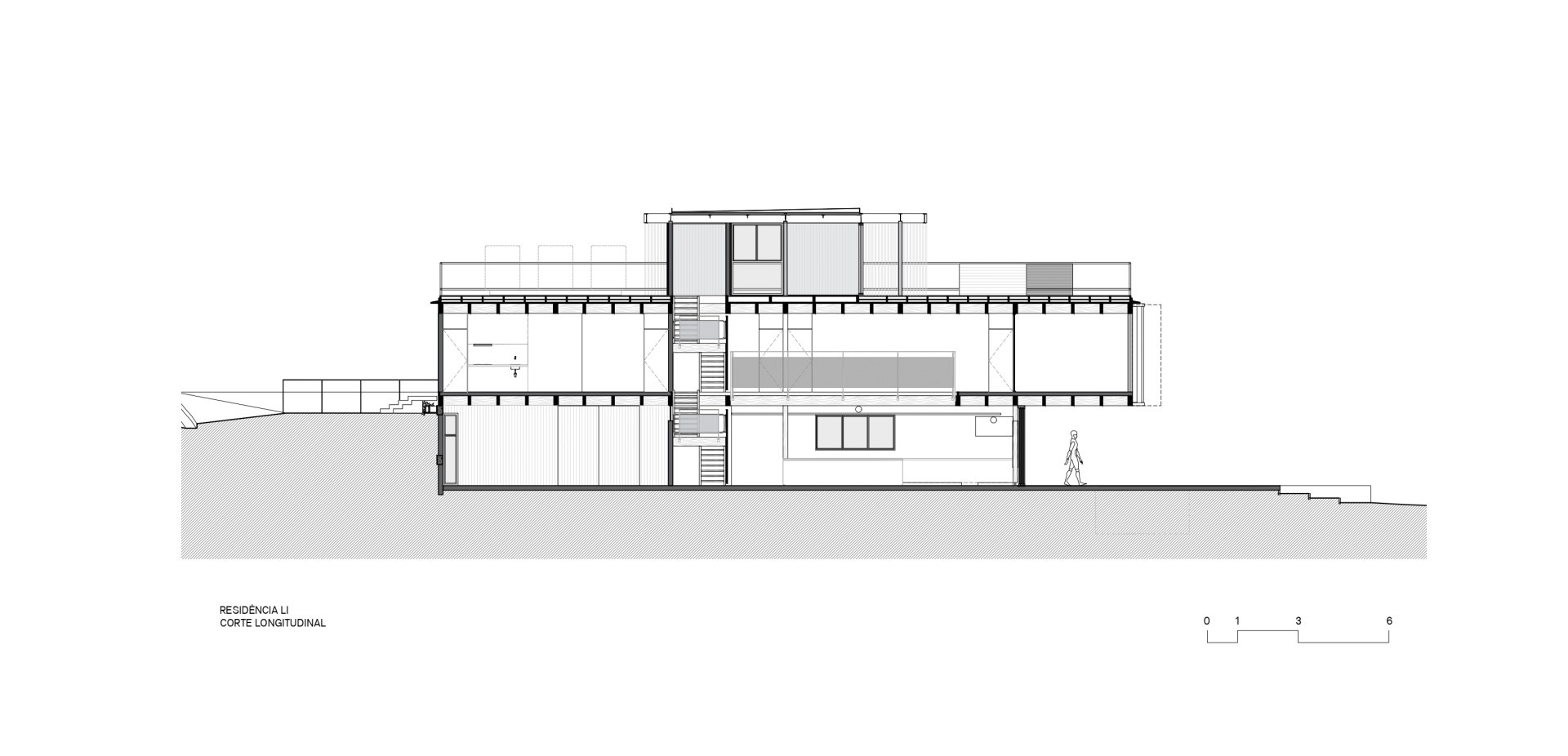 O programa, portanto, se configura em três pavimentos. O térreo, na cota da praia, parte de um arrimo de um lado e se estende com pilares de concreto armado, promovendo áreas técnicas como serviços, lavabo e quarto de hóspedes e abriga as áreas de uso coletivo da casa, como cozinha e salas integradas a partir de um grande caixilho de vidro que configura por sua vez a varanda com a piscina, no limite do terreno com abertura para o jardim da praia.