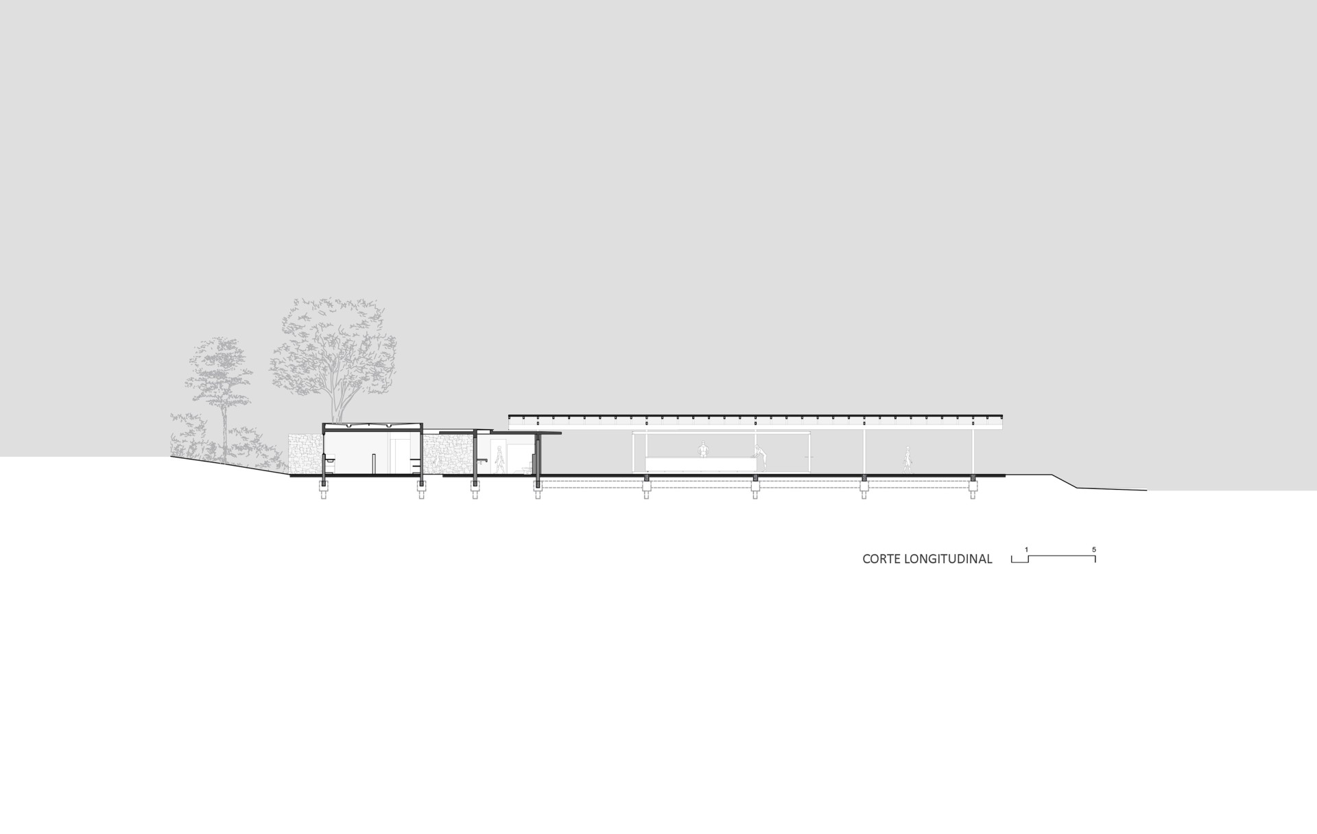 O revestimento em pedra do bloco de serviços também se faz em um material natural, remetendo a técnicas tradicionais, à tipologia do ambiente da fazenda e tecendo maior integração com a natureza ao redor. Seu programa abriga sanitários, cozinha, vestiários e demais serviços necessários para a logística dos eventos.