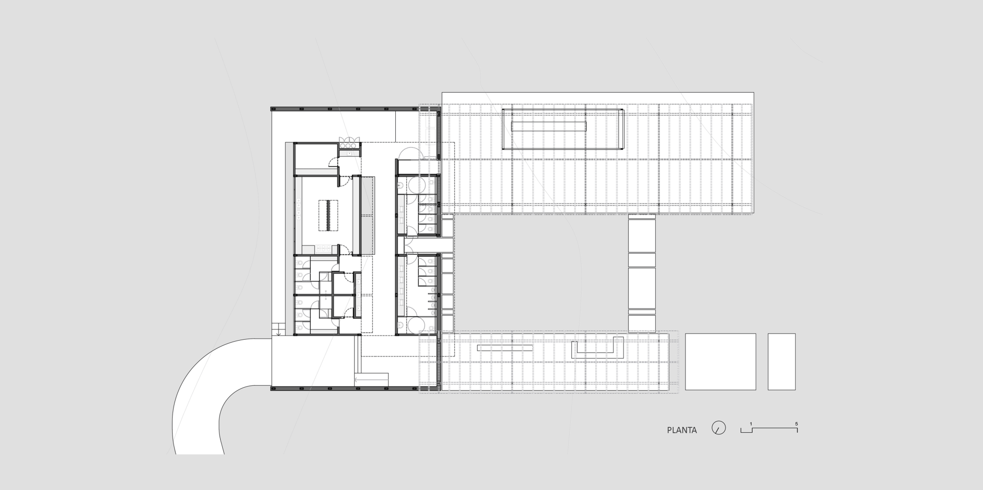 A implantação sugere uma releitura dos espaços dos currais nas fazendas, tradicionalmente compostas por duas coberturas que, por sua vez, configuram um pátio. Além disso, se preocupa em facilitar o fluxo de serviços, acessibilidade dos convidados e garantir a vista privilegiada para o vale.